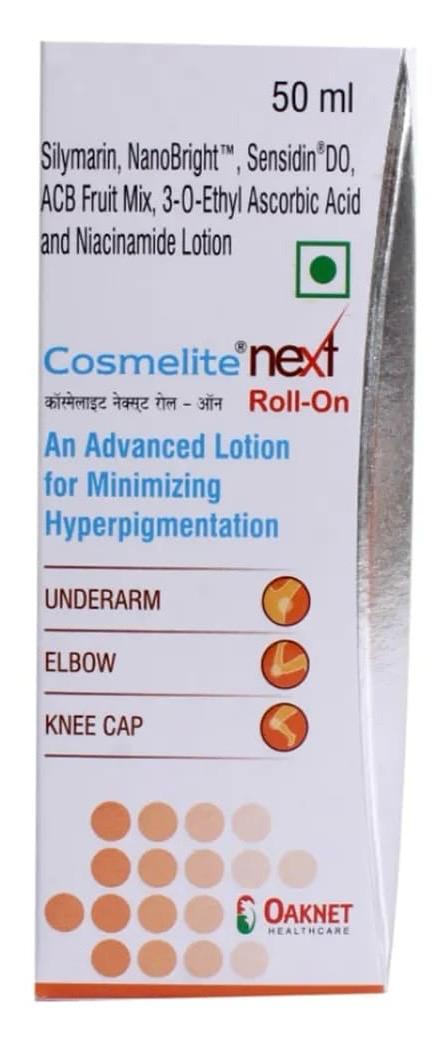 Cosmelite Next Roll-On Lotion 50 ml is used for minimising hyperpigmentation on the knees, elbows, and underarms. It contains Silymarin, Nanobright ™, ACB Fruit Mix, 3-0 Ethyl Ascorbic Acid and Niacinamide as its main ingredients. Silymarin is an antioxidant that can help protect the skin from free radical damage. Nanobright ™ can help brighten the skin and even out the skin tone. ACB Fruit Mix contains natural fruit acids that provide gentle exfoliation and promote cell turnover. 3-0 Ethyl Ascorbic Acid is a stable vitamin C derivative that can help reduce dark spots and brighten the overall skin tone. Niacinamide may help reduce the transfer of melanin to skin cells, thereby reducing dark spots and hyperpigmentation. It helps to lessen wrinkles and protects the skin from UV damage.Key Uses of Cosmelite Next Roll On Lotion 50ml